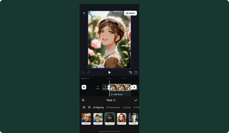 Trasforma le tue foto ordinarie in straordinarie opere d’arte con lo strumento di trasferimento di stile immagine AI di Filmora. In pochi secondi puoi applicare effetti artistici sorprendenti — dai classici dipinti a olio agli stili moderni più vivaci — e visualizzare subito l’anteprima del risultato. Che tu stia creando contenuti per i social, progetti personali o design professionali, Filmora ti permette di aggiungere un tocco creativo a ogni immagine con estrema facilità. Nessuna competenza tecnica richiesta — carica la foto, scegli lo stile e guarda la magia prendere vita!